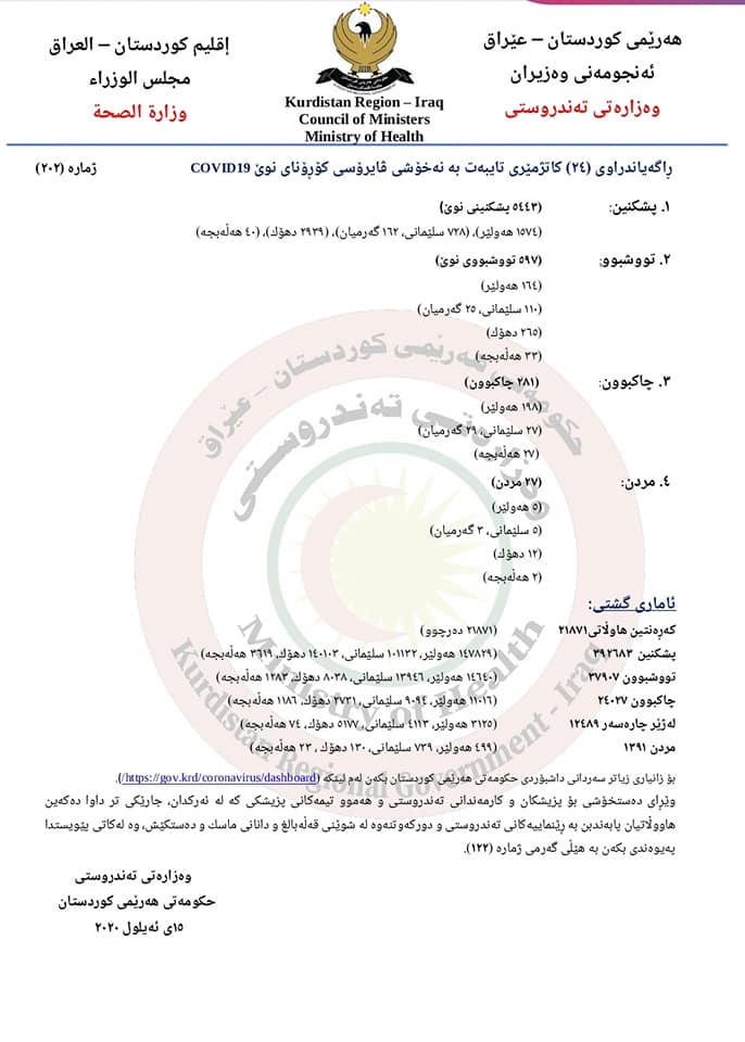 وه‌زاره‌تی ته‌ندروستی ئاماری 24 كاتژمێری رابردووی كۆرۆنای له‌ هه‌رێمی كوردستان راگه‌یاند