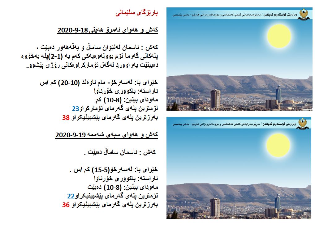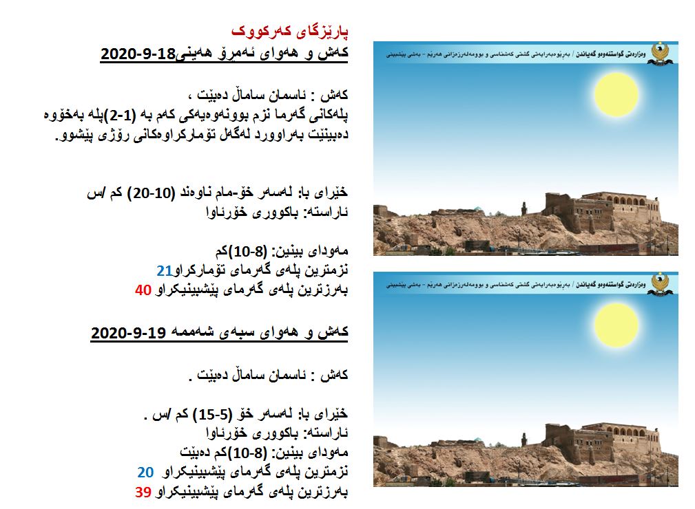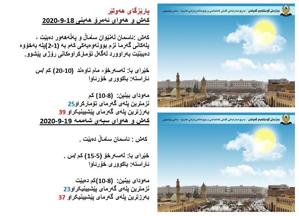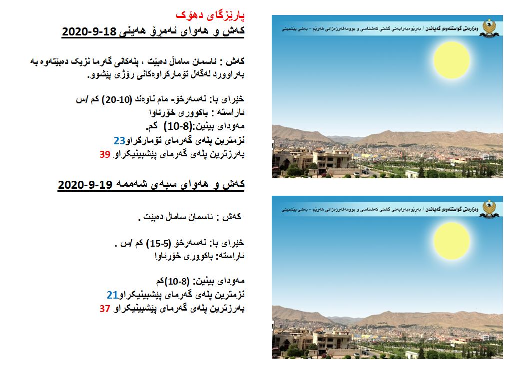 بەڕێوەبەرایەتی كەشناسی و بومەلەرزەزانی ھەرێمی كوردستان، پێشبینیەكانی بۆ 48 كاتژمێری كەشوھەوا راگەیاند، بەگوێرەی پێشبینیەكان ئەمڕۆ ئاسمان لەنێوان ساماڵ و پەڵە ھەور دەبێت. بەرزترین پلەی گەرما لە ھەولێر و دھۆك 39 و سلێمانی 38، لە كەركووك 40 پلەی سیلیزی دەبێت.