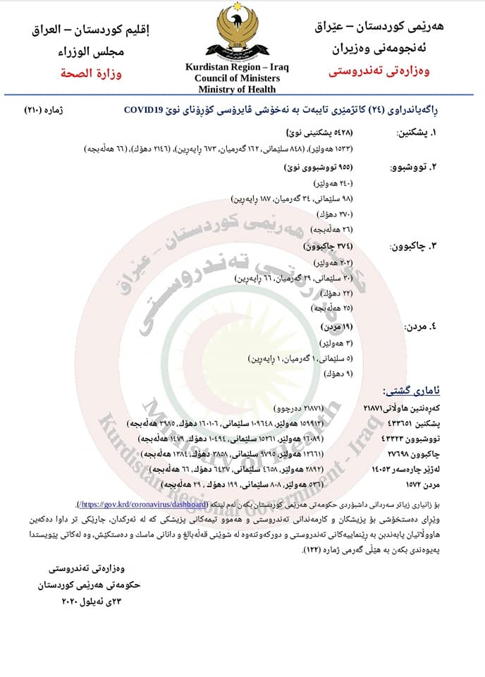ههرێمی كوردستان.. ئهمڕۆ زۆرترین ژمارهی تووشبوون به كۆرۆنا تۆماركرا
