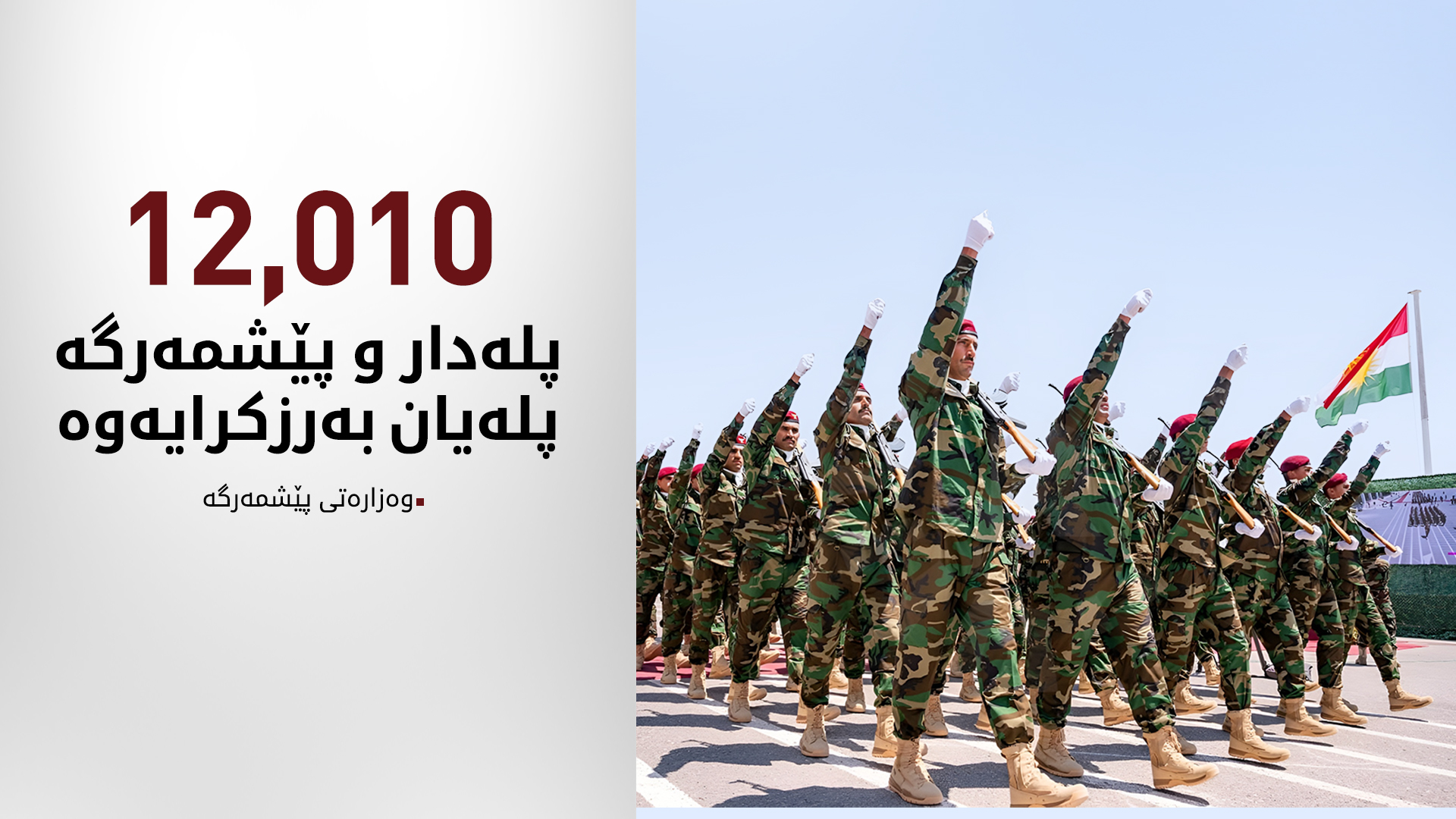 دووشەممە 4ـی ئابی 2025، وەزارەتی پێشمەرگە ڕایگەیاند: بە پێی فەرمانی وزاری وەزارەتی پێشمەرگەی حکوومەتی هەرێمی کوردستان و پاڵپشت بەماددەی چواردە لەسیستەمی ژمارە (6)ی ساڵی 2011ـی پەیڕەوی نیزامی ڕاژە و خانەنشینی پێشمەرگە تایبەت بەیاسای ژمارە (38)ـی ساڵی 2007، ئاماژە بە فەرمانی وەزاری وەزارەتی پێشمەرگە، تایبەت بەڕێنمایی پلە بەرزکردنەوەی کارمەندان ،بریاردرا بە بەرزکردنەوەی پلەی (12010) پێشمەرگەی سەر بەدیوان و لیواکانی پیادەی سەر بەوەزارەتی پێشمەرگە،  ڕاشیدەگەیەنێت: ئەم پلەبەرزکردنەوەیە گوزارشتە لە خشتەی نەورۆزی 2025ـی کارمەندان.