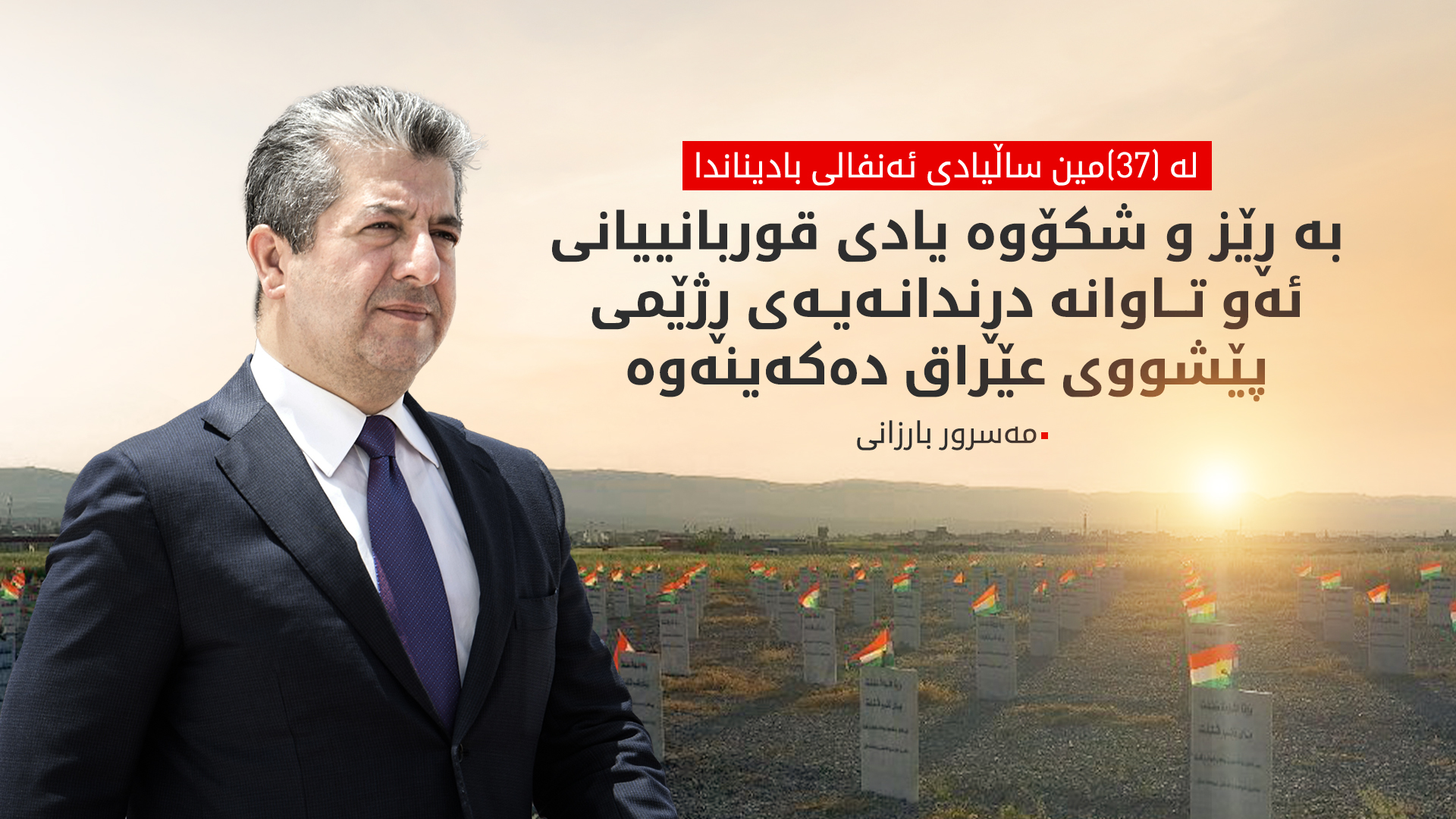 دووشەممە، 25ـی ئابی 2025، مەسرور بارزانی، سەرۆکی حکوومەتی هەرێمی کوردستان، لە تۆڕی کۆمەڵایەتیی 'ئێکس' پەیامێکی بەبۆنەی (37)ـەمین ساڵیادی تاوانی ئەنفالی بادینان بڵاوکردەوە.