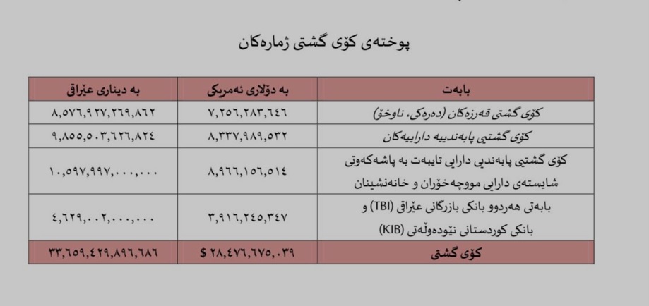 - بەڕێوەبەرایەتی بەڕێوەبردن و هەماهەنگی قەرزی گشتی لە سەرۆکایەتی ئەنجومەنی وەزیران، کاری کۆکردنەوەی زانیارییەکان و پۆڵێنکردن و ڕێکخستنەوەی ئەنجامداوە. کە ئێستا قەرز و پابەندییە داراییەکانی هەرێمی کوردستان بەم شێوەیەیە: