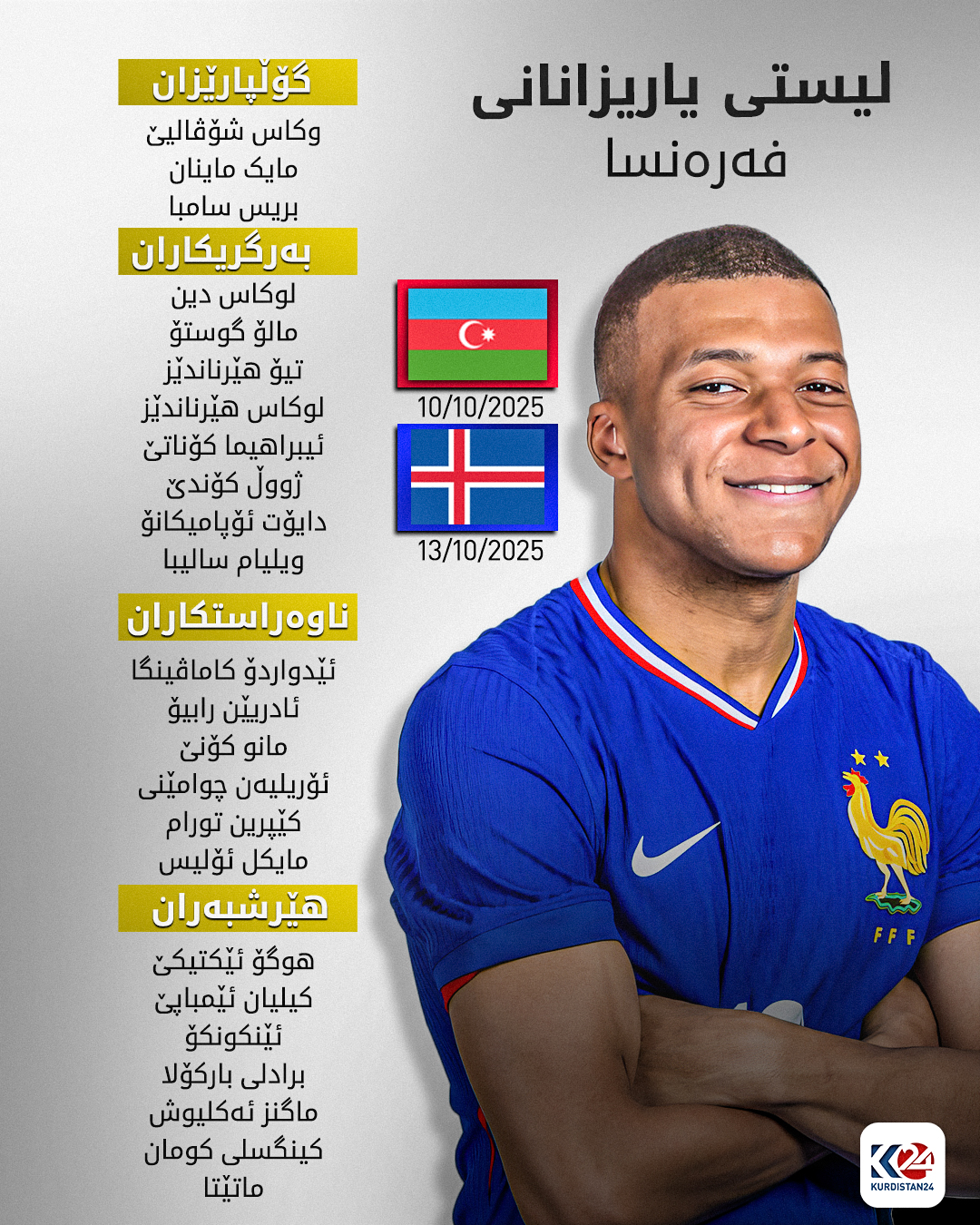 ئەمڕۆ پێنجشەممە، 2 ئەیلوولی 2025، دیدییە دیشامپ، راهێنەری هەڵبژاردەی فەرەنسا 23 یاریزانی بۆ دوو یاریی داهاتوو لە پاڵاوتنەكانی مۆندیال راگەیاند كە تێیدا بانگهێشتی عوسمان دێمبێلێ، دوۆێ و چوامینی نەكردووە، بەڵام بۆ هێڵی پێشەوە بانگهێشتی كینگسلی كۆمان یاریزانی نەسری سعوودیە و كلیان ئێمباپێی كردووە.