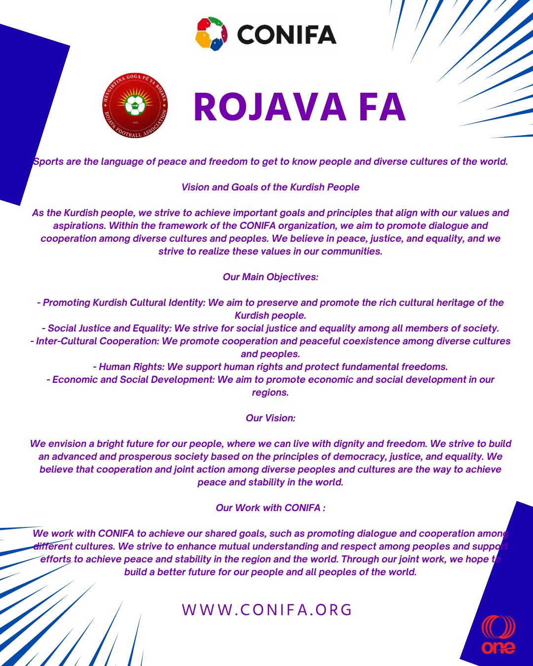 فیدراسیۆنی تۆپی پێی كۆنیفا لە بەیاننامەیەكدا رایگەیاندووە بەوپەڕی شانازی و خۆشحاڵییەوە ئەندامێكی دیكەی نوێ بۆ رێكخراوەكەیان بە ناوی "رۆژاڤای كوردستان" زیاد بووە و نووسیویەتی: ئێمە شارەزاییەكی زۆرمان لەبارەی چیرۆك و مێژووی نەتەوەی كورد هەیە و دەمانەوێت بەیەكەوە كلتور و ئامانجی نەتەوەكە زیاتر بە دوونیا بناسێنین و لە رێگەی وەرزشەوە كار بۆ بەدەستهێنانی مافەكانیان بكەین.