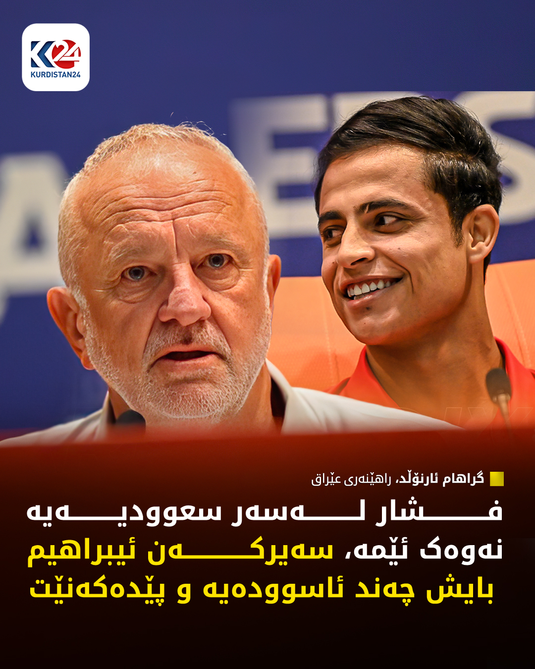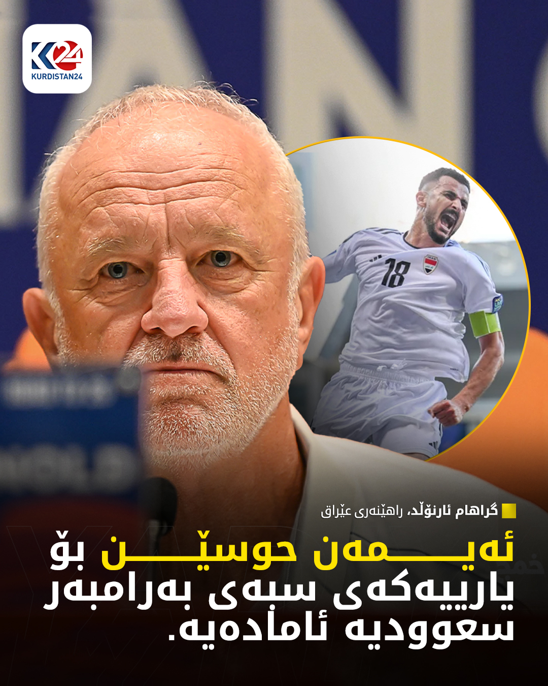 ئەمڕۆ دووشەممە، 13 ئۆكتۆبەری 2025، لە پرێس كۆنفرانسێكدا، راهێنەری هەڵبژاردەی عێراق، گراهام ئارنۆڵد رایگەیاند بۆ ئەم یارییە ئەیمەن حوسێن پێكانەكەی تێپەڕاندووە و بۆ رووبەڕووبوونەوەی سعوودیە ئامادە دەبێت، دەشڵێت: دڵخۆشم بە گەڕانەوەی ئەیمەن، تەنانەت ئەو یاریزانە لە داهاتوو راهێنەرێكی باشی لێ دەردەچێت.