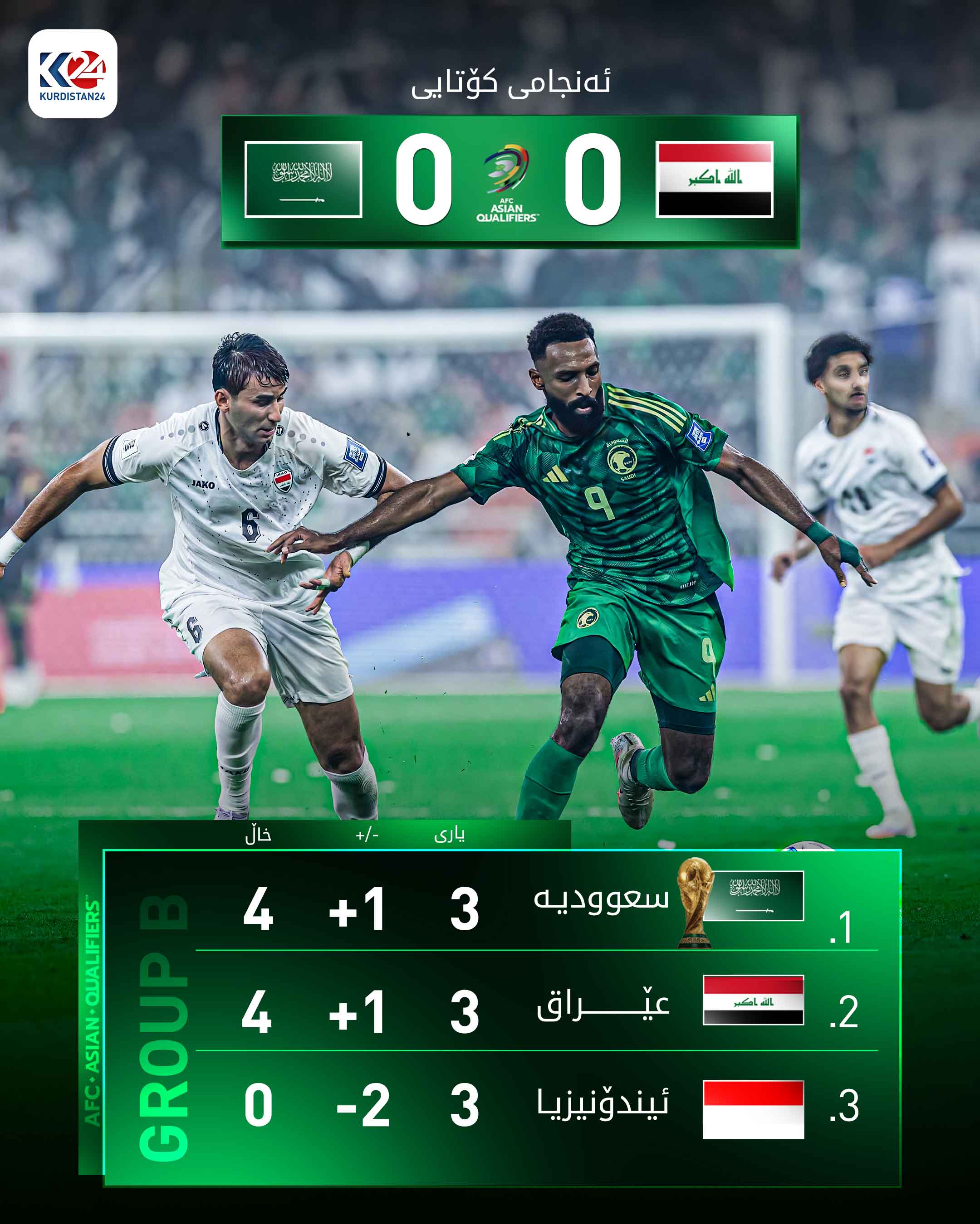 لە قۆناغی سێیەمی پاڵاوتنەكانی مۆندیالی 2026، هەڵبژاردەی عێراق لەبەردەم زیاتر لە 60 هەزار هاندەری تیپی بەرامبەر بووە میوانی سعوودیە، یارییەكەش بە یەكسانبوون بەبێ گۆڵ كۆتایی هات، بەم ئەنجامەش عێراق نەیتوانی راستەوخۆ بگاتە مۆندیال، بەڵام سعوودیە راستەوخۆ گەیشتە مۆندیالی 2026.