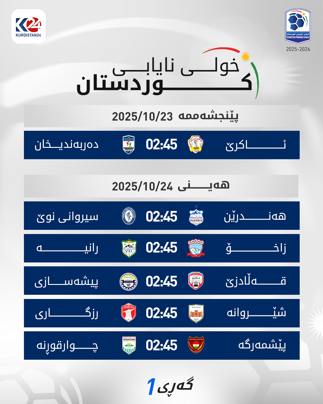 یارییەكانی دیكەی گەڕی یەكەم لە رۆژی هەینی داهاتوو بەمشێوەیە دەبێت: (هەندرێن ـ سیروانی نوێ)، (زاخۆ ـ رانیە)، (پێشمەرگەی هەولێر ـ چوارقوڕنە)، (قەڵادزێ ـ پیشەسازی)، (شێروانە ـ رزگاری)، سەرجەم یارییەكانیش لە كاتژمێر 02:45 خولەكی ئێوارە دەكرێن.