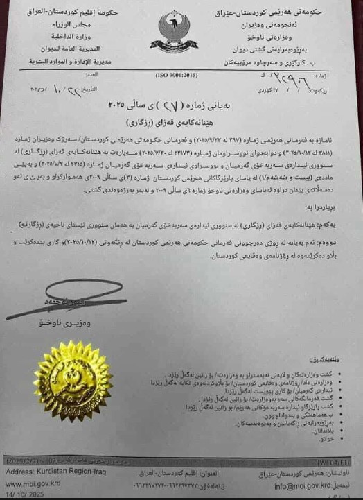 ئەم بڕیارە لەسەر فەرمانی مەسرور بارزانی، سەرۆکی حکوومەتی هەرێمی کوردستان دەرچووە.