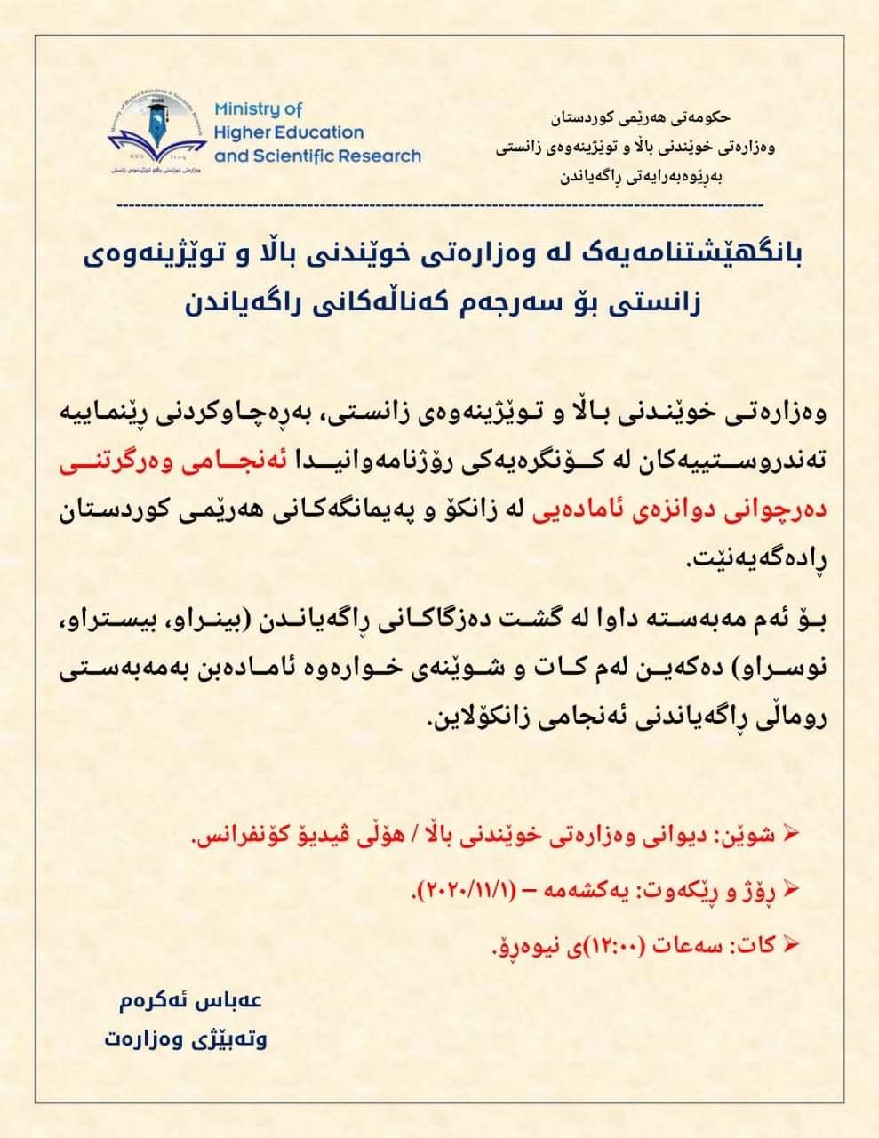 عەباس ئەكرەم، وتەبێژی وەزارەتی خوێندنی باڵا بە كوردستان24ی راگەیاند: "ئەمڕۆ یەكشەممە 1/11/2020 لە كۆنفرانسێكی رۆژنامەوانیدا لە دیوانی وەزارەتی خوێندن، ئەنجامی وەرگرتنی دەرچووانی 12ی ئامادەیی لە زانكۆ و پەیمانگەكان رادەگەیەندرێت".