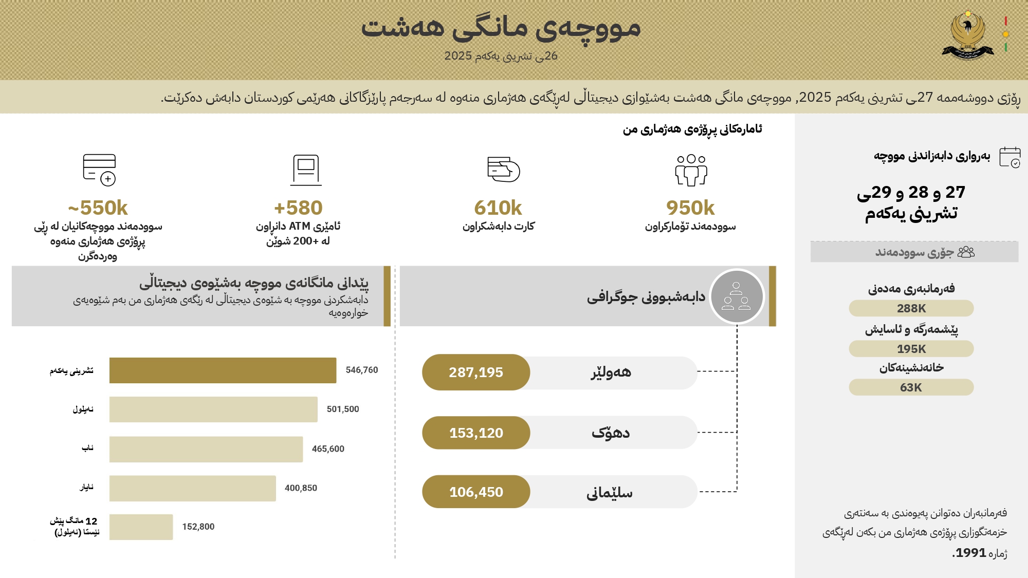 تیمی پرۆژەی هەژماری من لە ڕاگەیەنراوێکدا ئاماژەی بەوە دا، سبەی دووشەممە 27ـی تشرینی یەکەمی 2025، مووچەی مانگی هەشت (ئاب) بە شێوەی دیجیتاڵی، لە ڕێگەی هەژماری منەوە لە سەرجەم پارێزگاکانی هەرێمی کوردستان دابەش دەکرێت.