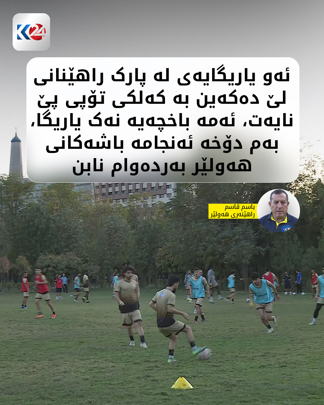 باسم قاسم راهێنەری هەولێر گلەیی لە یاریگای راهێنانەکانی یانەکەی دەکات و دەڵێت چۆن دەبێت یانەیەکی وەکو هەولێر یاریگای تایبەت بە راهێنانەکانی نەبێت و دەشڵێت ئەو یاریگایەی لە پارک راهێنانی لێ دەكەین باخچەیە نەک یاریگا، ئەركی منە ئاگادارتان بكەمەوە ناتوانین بەم دۆخە ئەنجامەكانمان باشتر بكەین.