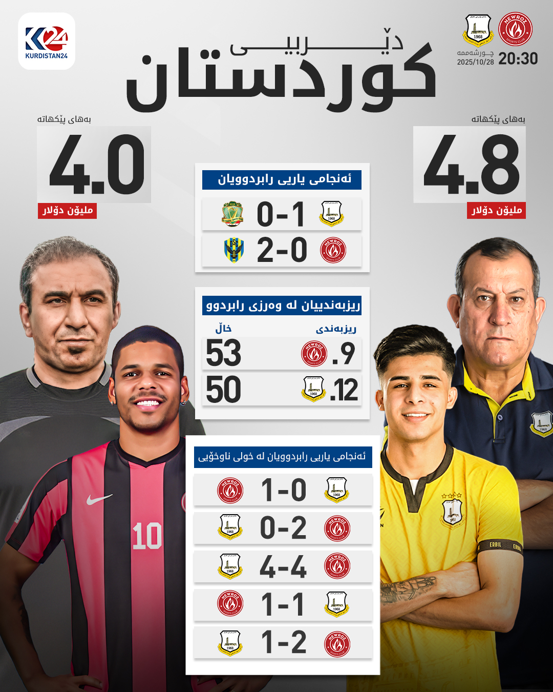 لە گەڕی شەشەمی خولی ئەستێرەكانی عێراق، یانەی هەولێری پایتەخت بۆ رووبەڕبوونەوەی یانە زامدارەكەی كوردستان سەردانی شاری سلێمانی كردووە، ئەم یارییە دەبێتە یەكەمین یاریی نەورۆز لەم وەرزە لەژێر سەرپەرشتی راهێنەری نوێی یانەكە وەلی كەریم، یارییەكەش لە كاتژمێر 08:30ـی ئەمشەو بەڕێوە دەچێت.
