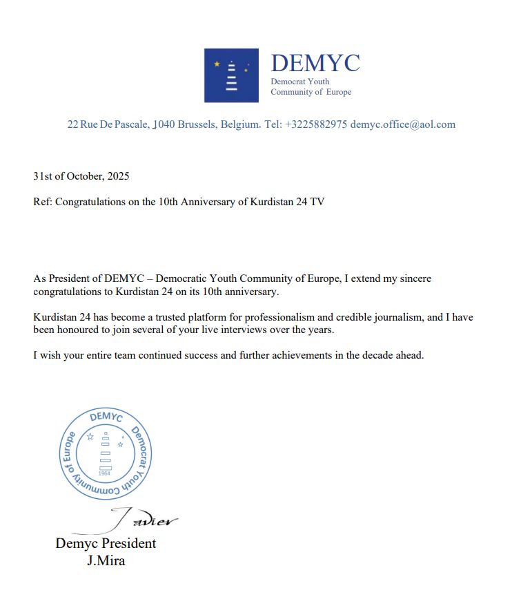 وەک سەرۆکی لاوانی دیموکراتی ئەورووپا، دڵسۆزی خۆم پێشکەش دەکەم، کوردستان 24 بووەتە سەکۆیەکی متمانەپێکراو بۆ پیشەیی بوون و ڕۆژنامەگەریی باوەڕپێکراو، من شەرەفمەند بووم کە بەشداری چەندین چاوپێکەوتنی ڕاستەوخۆتان بکەم لە ماوەی ساڵانی ڕابردوودا.