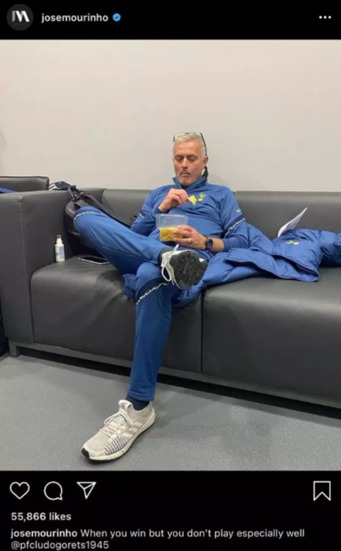 خۆزێ مۆرینیۆ، بەرێوەبەری هونەری یانەی تۆتێنهامی ئینگلیزی دوای بردنەوەی یانەکەی لە گەڕی سێیەمی یۆرۆپالیگ بەرامبەر لۆدۆگۆریتسی دانیمارکی، دوای یارییەکە وێنەیەکی لە کاتی خواردنی جپس لە تۆڕی کۆمەڵایەتی ئینستاگرام بڵاوکردەوە.