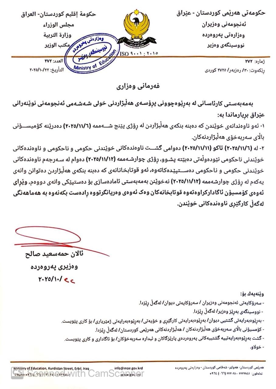 پێشتر وەزارەتی پەروەردەی حكوومهتی هەرێمی کوردستان، لە ڕاگەیەندراوێکدا ئاشکرای کرد، بە مەبەستی کارئاسانی بۆ بەڕێوەچوونی پرۆسەی هەڵبژاردنی خولی شەشەمی پهرلهمانی عێراق، ڕۆژی پێنجشەممە، 6ـی تشرینی دووەمی 2025 پشووی فەرمی لەسەرجەم ناوەندەکانی خوێندن دەستپێدەکات.