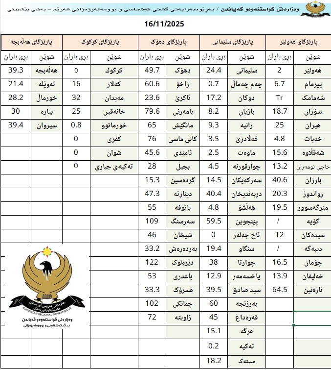 کەشناسیی هەرێم ڕایگەیاند، پێشبینی دەکرێت ئەمڕۆ یەکشەممە، 16-11-2025، ئاسمان هەورى تەواو بێت، ئەم شەپۆلە بارانەشی ڕووى لە ناوچەکەمان کردووە بەردەوامى دەبێت، هەندێ کاتیش لە ناوچە جیاجیاکان باران بەشێوەی پچڕ پچڕ دەبێت، بەڵام لە ناوچە شاخاوییەکان ئاستى دابارین زیاتر دەبێت.