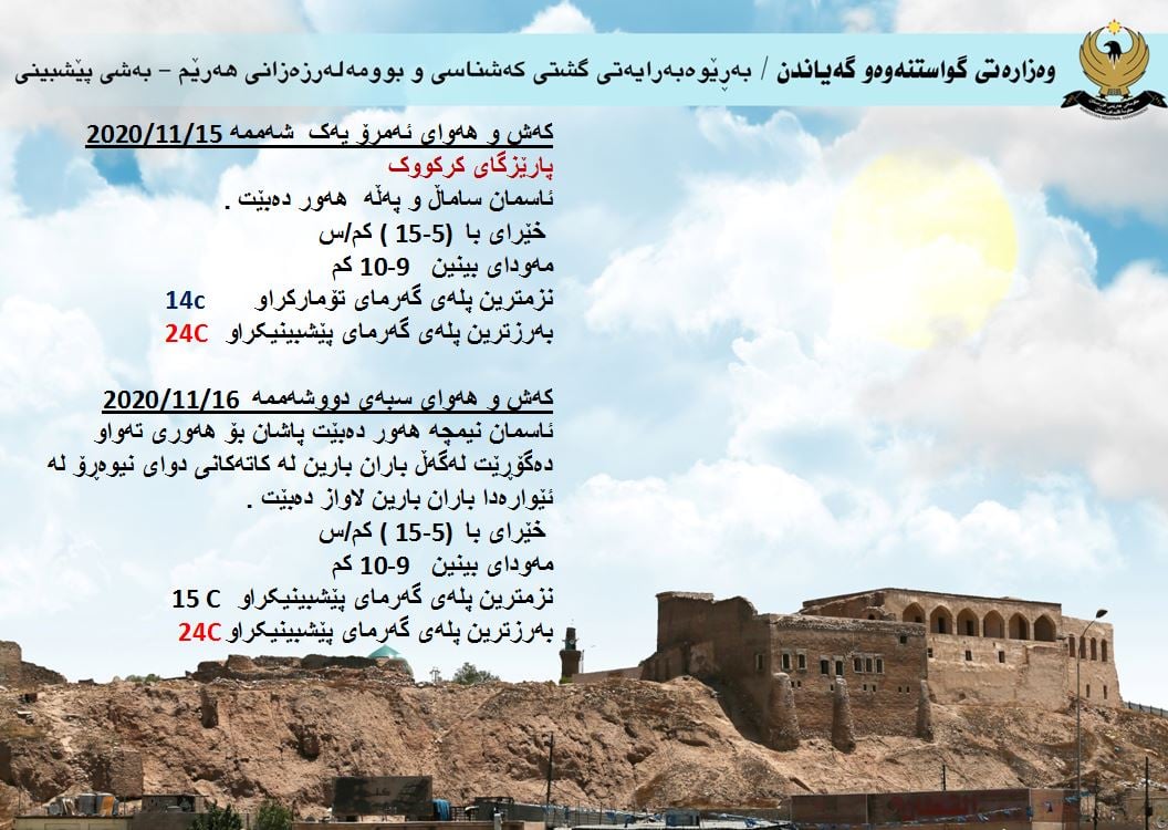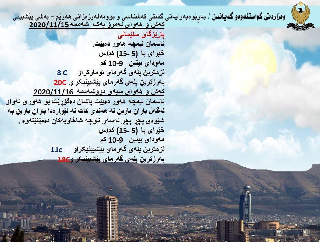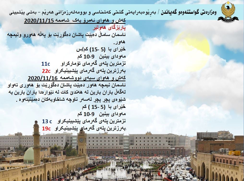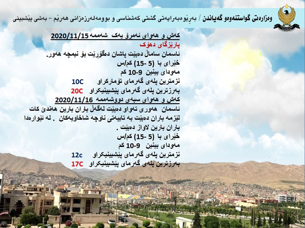 كەشناسی راشیگەیاندووە، پێشبینى بارانبارین بۆ تەواوى ناوچەکەمان هەیە، سنوورى پارێزگاى دهۆک و هەولێر بارانى زیاتر دەبێت لە ئێوارەى رۆژى دووشەممە بارانبارین لەسەر ناوچە شاخاوییەکان دەمێنێتەوە و نزم بوونەوەى پلەکانى گەرما بە نزیکەى 2 تا 3 پلەى سیلیزى . لە شەودا کاریگەرى ئەم بارانبارینە کۆتاى دێت .