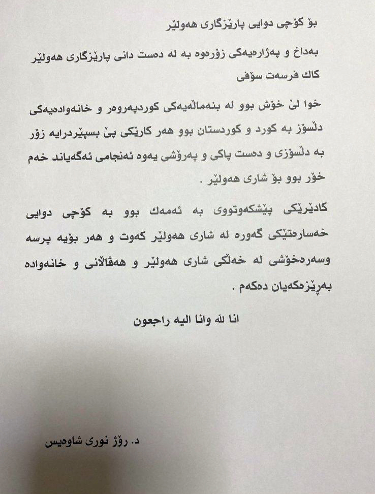 دەقی پەیامی د. رۆژ نوری شاوێس بۆ كۆچی دوایی فرسەت سۆفی: