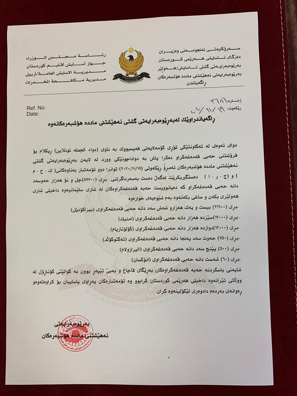 به گوێرهی راگهیهندراوێكی بهڕێوهبهرایهتییهكه، ئهمڕۆ پێنجشهممه 19/11/2020 بڵاویكردووهتهوه، دوو كهسهكه بهناوهكانی (ك. ح. م.) و (ج. ر. أ.) دهستگیركراون، حهبهكانیان له وڵاتی ئێرانهوه هێناوهته ناو ههرێمی كوردستان بهبێ ئهوهی به كوالیتی كۆنتڕۆڵ و پشكنیندا تێپهڕبێت، دواتریش ویستوویانه له سلێمانی بیانهێننه ههولێر و ساغیان بكهنهوه.