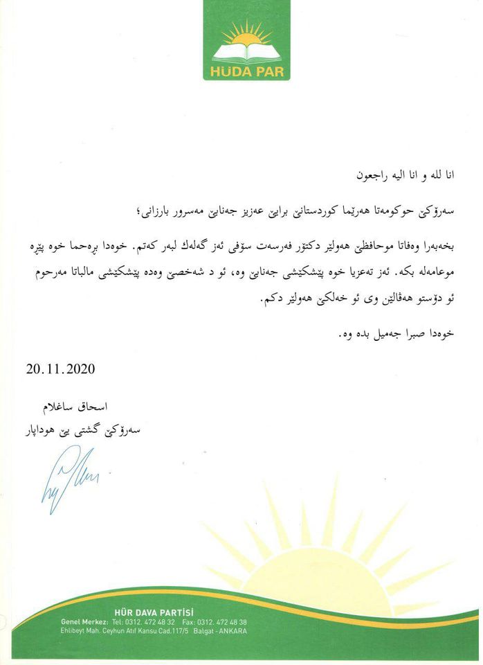 سه‌رۆكی گشتیی "هوداپار"، ئیسحاق ساغلام پرسه‌نامه‌یه‌كی ئاراسته‌ی سه‌رۆكی حكومه‌تی هه‌رێمی كوردستان، مه‌سرور بارزانی كرد.