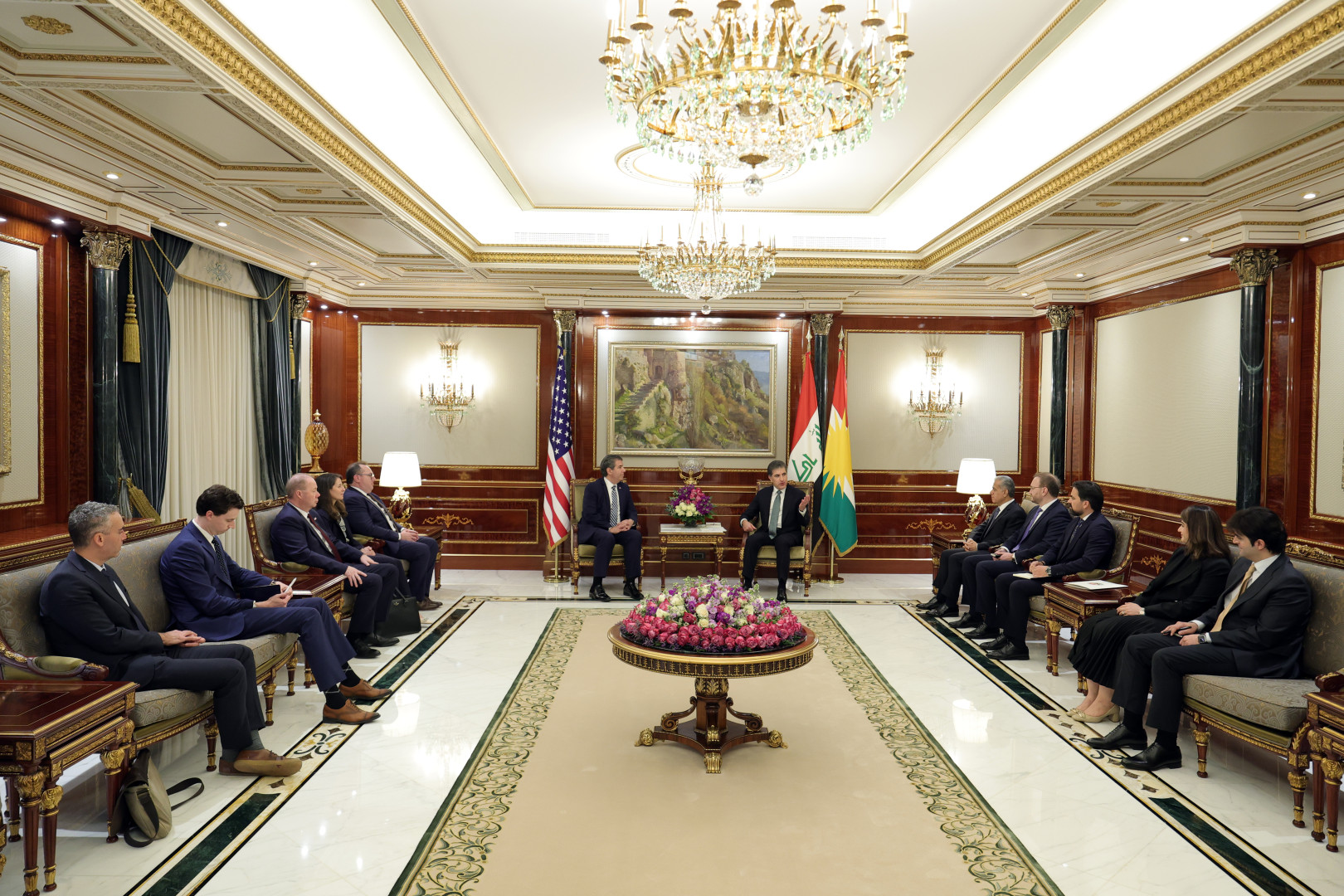 نيوهڕۆى ئهمڕۆ چوارشهممه، 3ـی کانوونی یەکەمی 2025، نێچيرڤان بارزانى، سهرۆكى ههرێمى كوردستان، پێشوازیى له مايكڵ ڕيگهس، جێگرى وهزيرى دهرەوهى ئهمهريكا كرد كه بۆ كردنهوهى تهلارى تازهى كونسوڵخانهى گشتيى ئهمهريكا له ههولێر، سهردانى ههرێمى كوردستانى كردووه.