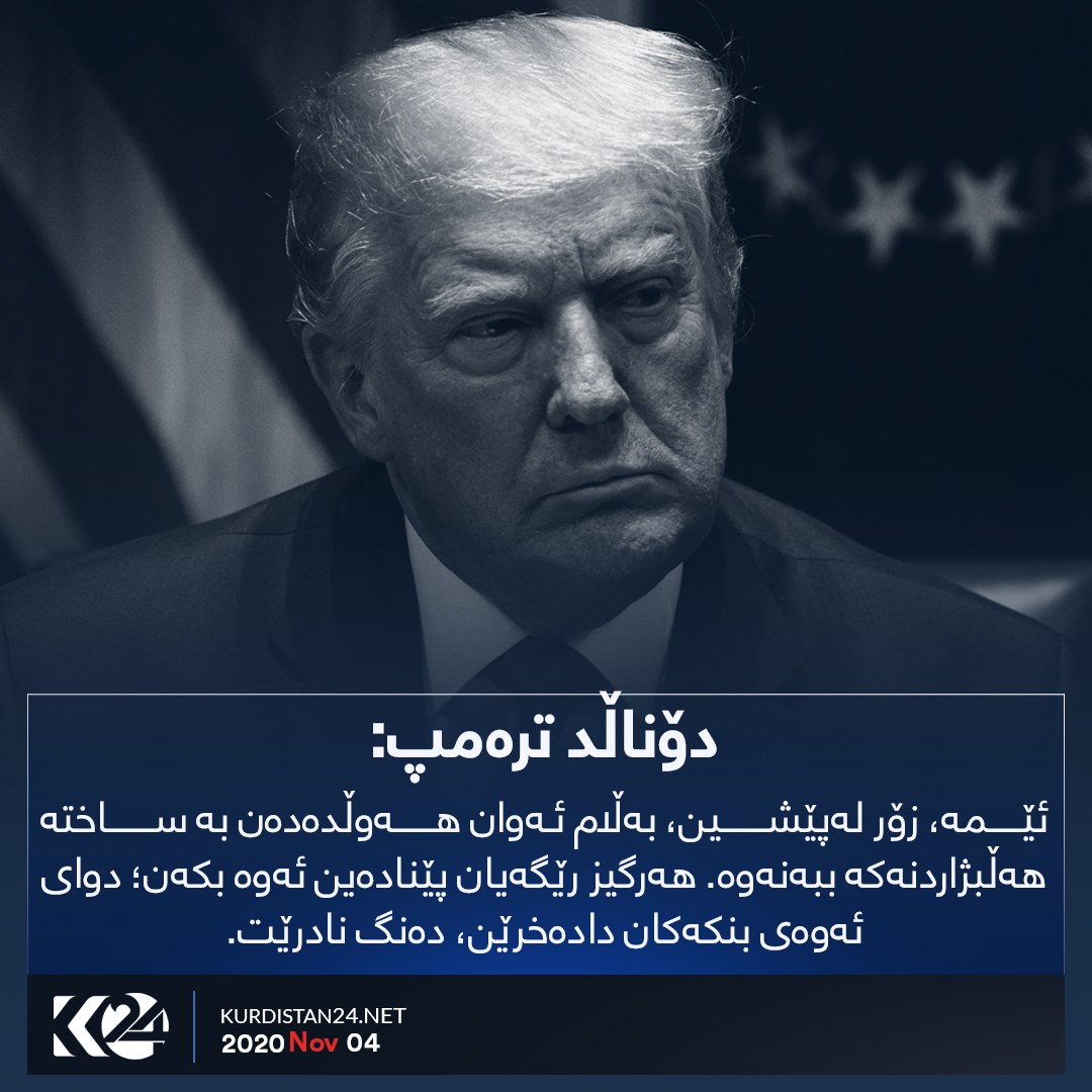 ترەمپ، گوتی دواتر گوتاری دەبێت و لە توویتەکەشیدا دەڵێ "هەرگیز رێگەیان پێنادەین (ساختەکاری بکەن). کاتێک بنکەکان دادەخرێن، ناتوانرێت دەنگی دیکە بدرێت".