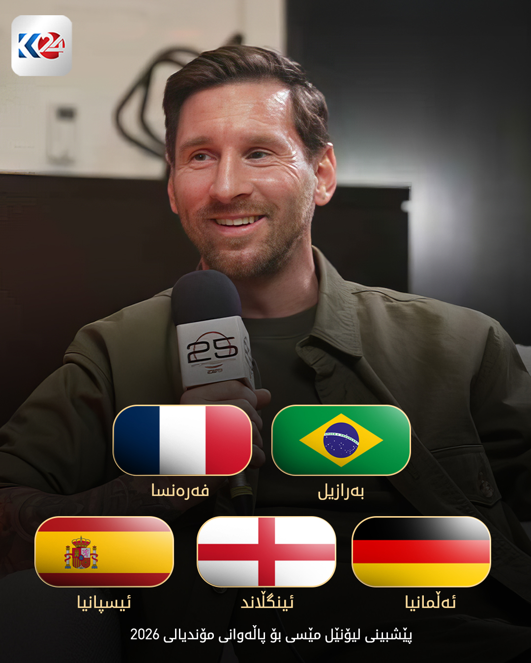 لەبارەی پێشبینیكردنی بۆ براوەی مۆندیالی داهاتووی 2026، لیۆنێل مێسی كاپتنی یانەی ئینتەر مەیامی رایگەیاند هەڵبژاردەكانی ئیسپانیا، فەرەنسا، ئینگلاند، بەرازیل و ئەڵمانیا بەهێزترین بەربژێرن بۆ بردنەوەی جامی جیهانی 2026.