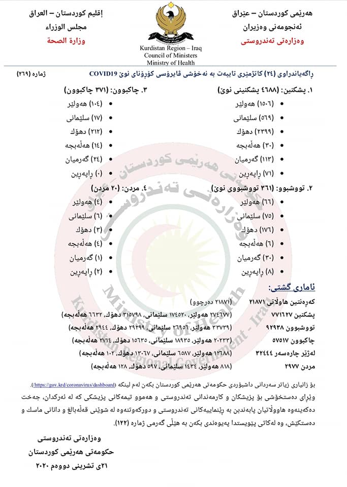 وه‌زاره‌تی ته‌ندروستی حكومه‌تی هه‌رێمی كوردستان، ئاماری 24 كاتژمێری رابردووی تایبه‌ت به‌ كۆرۆنا بڵاوكرده‌وه‌ و به‌ گوێره‌ی ئاماره‌كه‌ش، ژماره‌ی تووشبووان به‌ شێوه‌یه‌كی به‌رچاو كه‌مبووه‌ته‌وه‌، كه‌ 361 كه‌س تووشی په‌تای كۆرۆنا بوونه‌، 20 تووشبووی كۆرۆناش گیانیان له‌ده‌ستداوه‌.