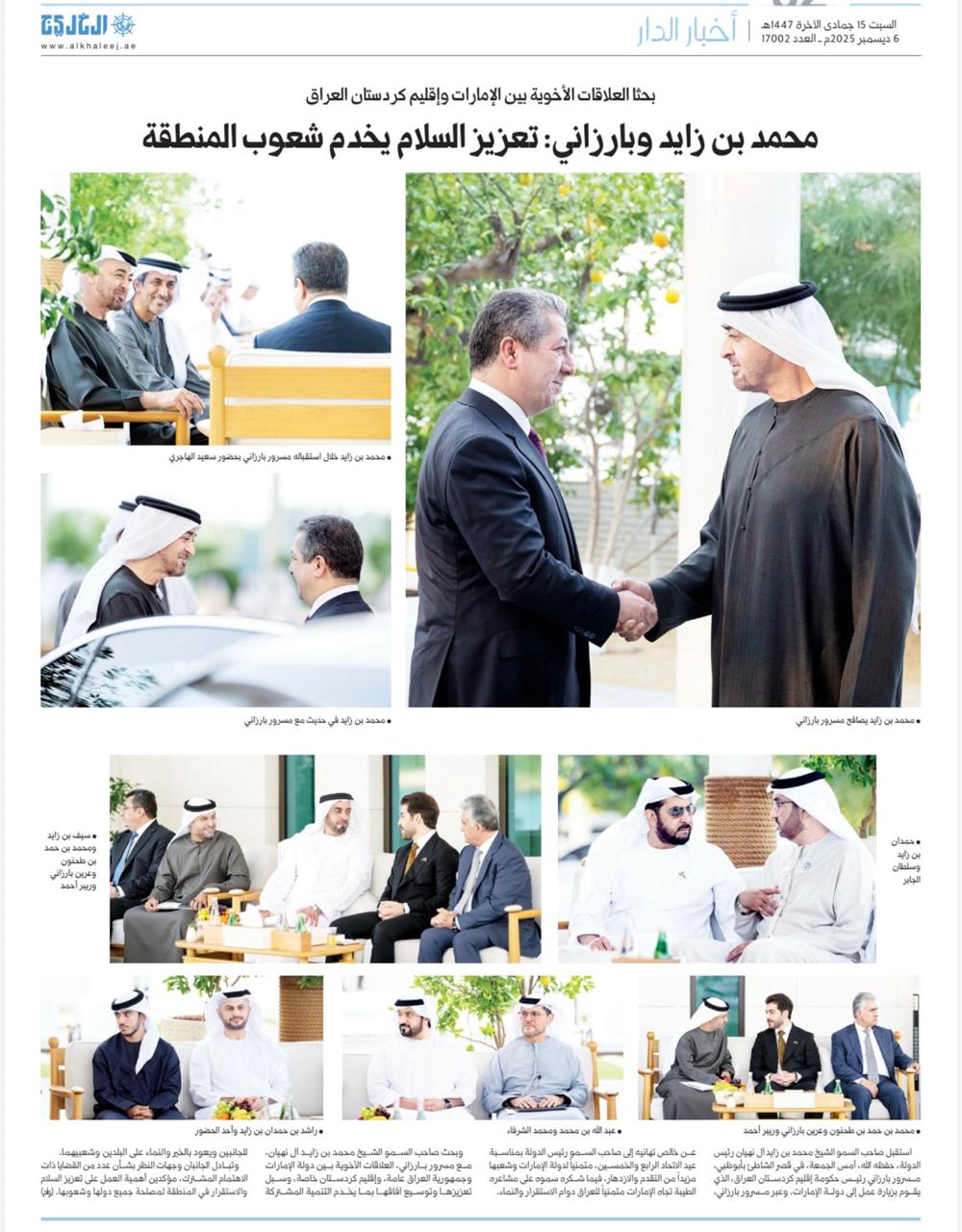 ڕۆژنامە پڕخوێنەرەکانی وەک (البیان، الاتحاد، الخلیج، الفجر، و الوطن) لە ژمارەی ئەمڕۆیاندا (شەممە، 06ـی کانوونی یەکەمی 2025)، وێنەی کۆبوونەوەکەیان لە لاپەڕە سەرەکییەکانیان بڵاوکردووەتەوە و جەختیان لەسەر گرنگیی ئەم دیدارە بۆ پەرەپێدانی پەیوەندییەکان کردووەتەوە.