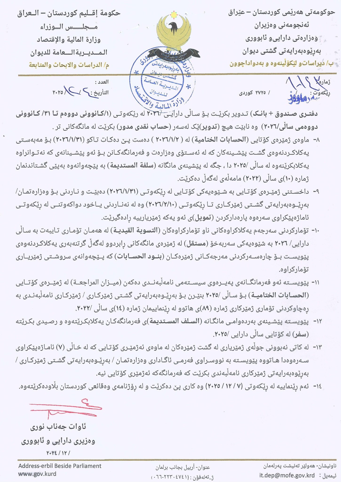 وەزارەتی دارایی ئاماژەی بەوەش داوە، داخستنی ژمێرەی کۆتایی (الحسابات الختامیة) بە شێوەیەکی کۆتایی لە 31ی کانوونی دووەمی 2026 دەبێت و پێویستە تا 10ی شوباتی 2026 ڕەوانەی بەڕێوەبەرایەتیی گشتیی ژمێریاری بکرێت، بە پێچەوانەوە هەر فەرمانگەیەک دوا بکەوێت پارەدارکردنی (تمویل) ڕادەگیرێت.