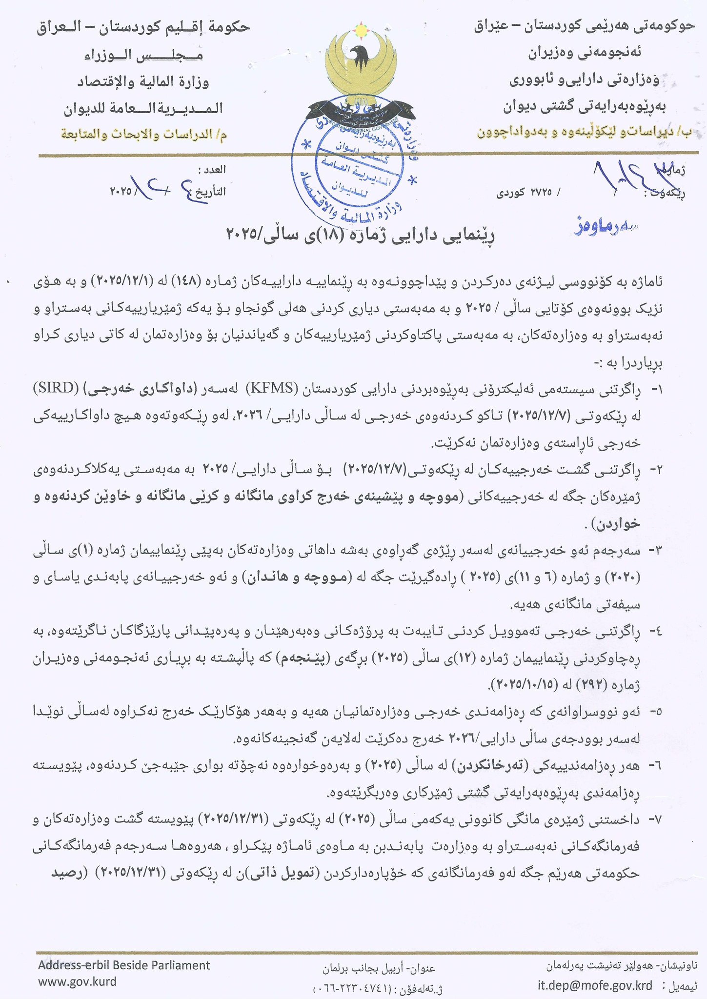 دەقی ڕێنمایی دارایی ژمارە (18)ی ساڵی 2025: