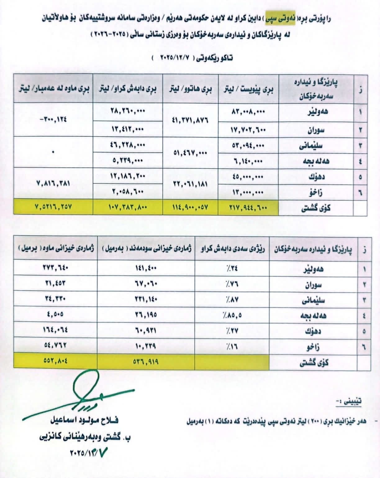 ئەمرۆ یەکشەممە، 7ـی کانوونی یەکەمی 2025، بەرێوەبەرایەتی گشتیی وەبەرهێنانی کانزایی داتای دابەشکردنی نەوتی ماڵانی بڵاوکردەوە و ڕایگەیاند، تا ئێستا زیاتر لە 107 ملیۆن لیتر نەوتی سپی بەسەر نزیکەی 537 هەزار خێزان لە پارێزگا و ئیدارە سەربەخۆکانی هەرێم دابەش کردووە.