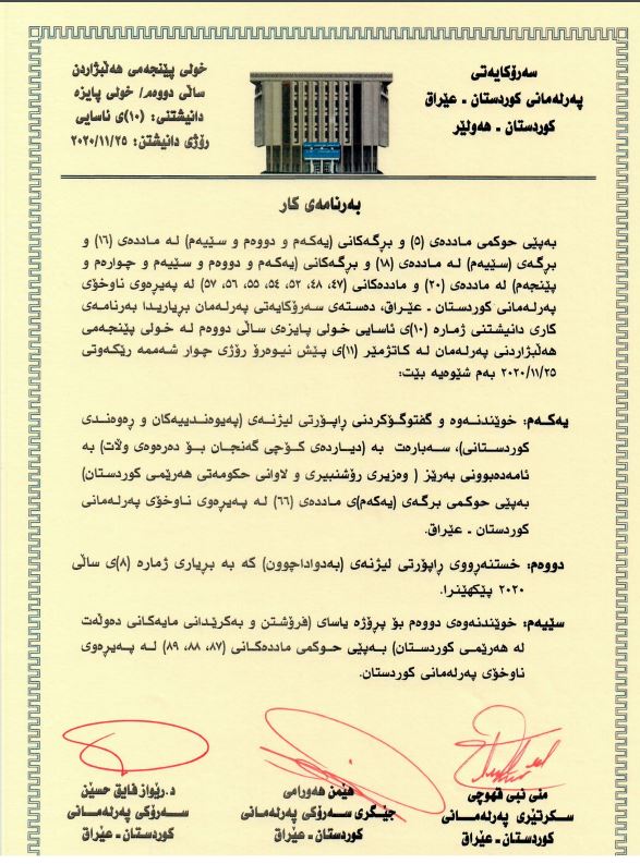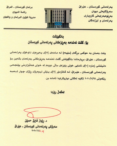 لە بانگھێشتنامەی سەرۆكی پەرلەمانی كوردستان بۆ پەرلەمانتاران ئاماژە بەوەكراوە، دانیشتنی ژماره (10)ی ئاسایی خولی پاییزهی ساڵی دووهم لهخولی ههڵبژاردنی پێنجهمی پهرلهمانی كوردستان، له كاتژمێر 11ى پێشنیوهڕۆی رۆژی چوارشهممه رێكهوتی 2020/11/25، بەڕێوەدەچێت.