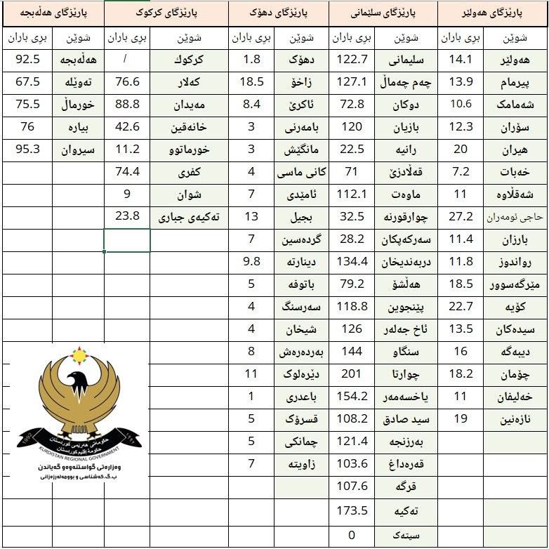 بڕی بارانی 24 کاتژمێری ڕابردووی شار و شارۆچکەکانی هەرێمی کوردستان.