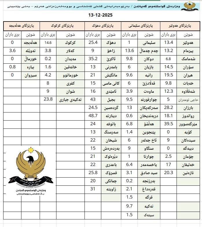 کەشناسیی هەرێم ڕایگەیاند، پێشبینی دەکرێت کەشی ئەمڕۆ شەممە، 13/12/2025، ئاسمان هەوری تەواو بێت لەگەڵ بارینی بارانی پچڕ پچڕی بەردەوام تاوەکو ئێوارە، هەروەها بەفرێکی کەمیش لە ناوچە شاخاویە سنووریەکان دەبارێت.