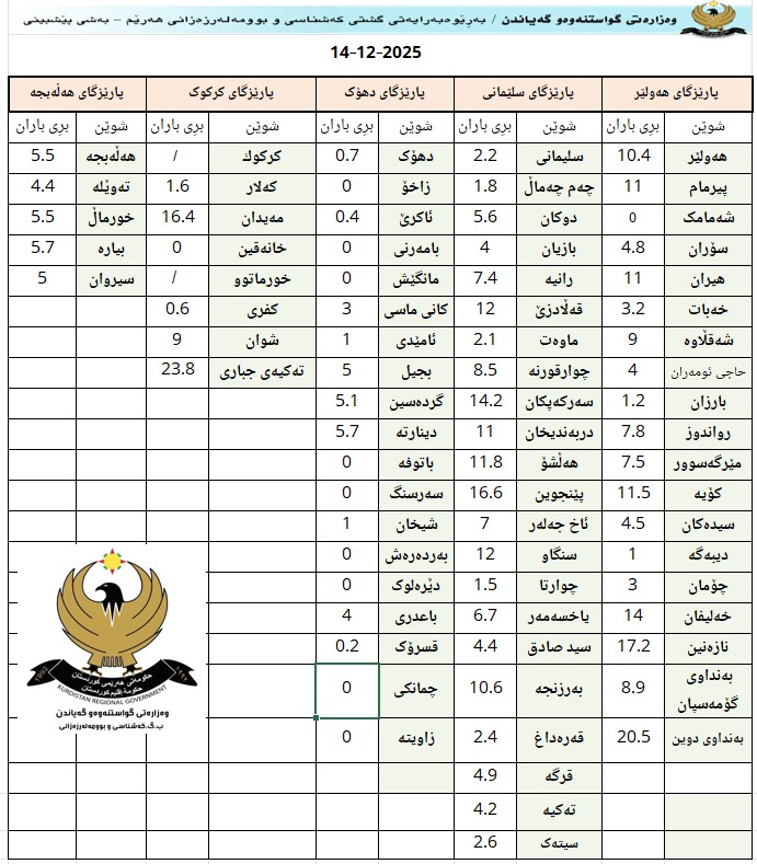 بەگوێرەی ڕاگەیەندراوەکەی کەشناسی، ئەمڕۆ یەکشەممە، 14-12-2025، ئاسمان بە گشتی نیمچە هەور دەبێت لەگەڵ دروستبوونی تەم لە ناوچە جیاجیاکاندا، لە دوای نیوەڕۆوە لە هەندێک ناوچەی شاخاوی سنووری ئەگەری بەفربارین هەیە و لە ناوچە شاخاوییە بەرزەکانیش ئەگەری نمەباران هەیە.
