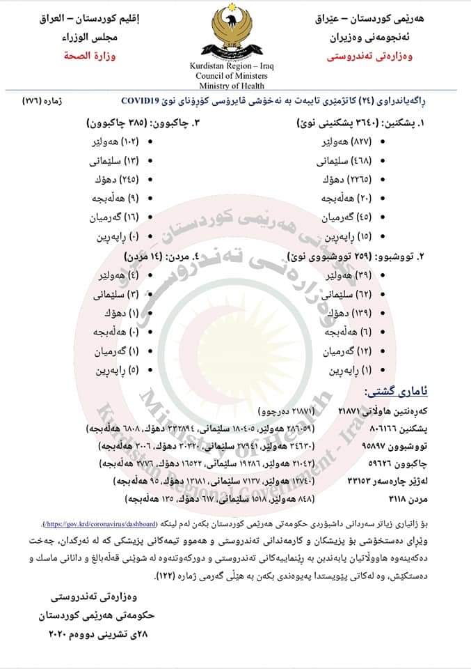 ئه‌و ئاماره‌ی ئه‌مڕۆ شه‌ممه‌ 28/11/2020 وه‌زاره‌تی ته‌ندروستی بڵاویكردووه‌ته‌وه‌، به‌ به‌راورد به‌ 2 مانگی رابردوو، رێژه‌ی تووشبوون به‌ كۆرۆنا، نزیكه‌ی 70% دابه‌زیوه‌.