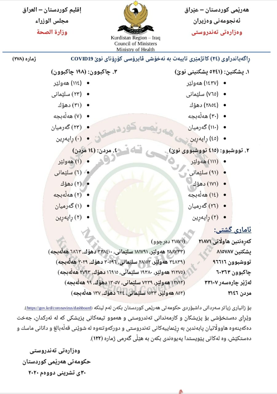له‌ سه‌رتاسه‌ری كوردستانیش، 198 تووشبووی كۆرۆنا چاكبوونه‌ته‌وه‌، كه‌ زۆرترینیان له‌ شاری دهۆك بووه‌.
