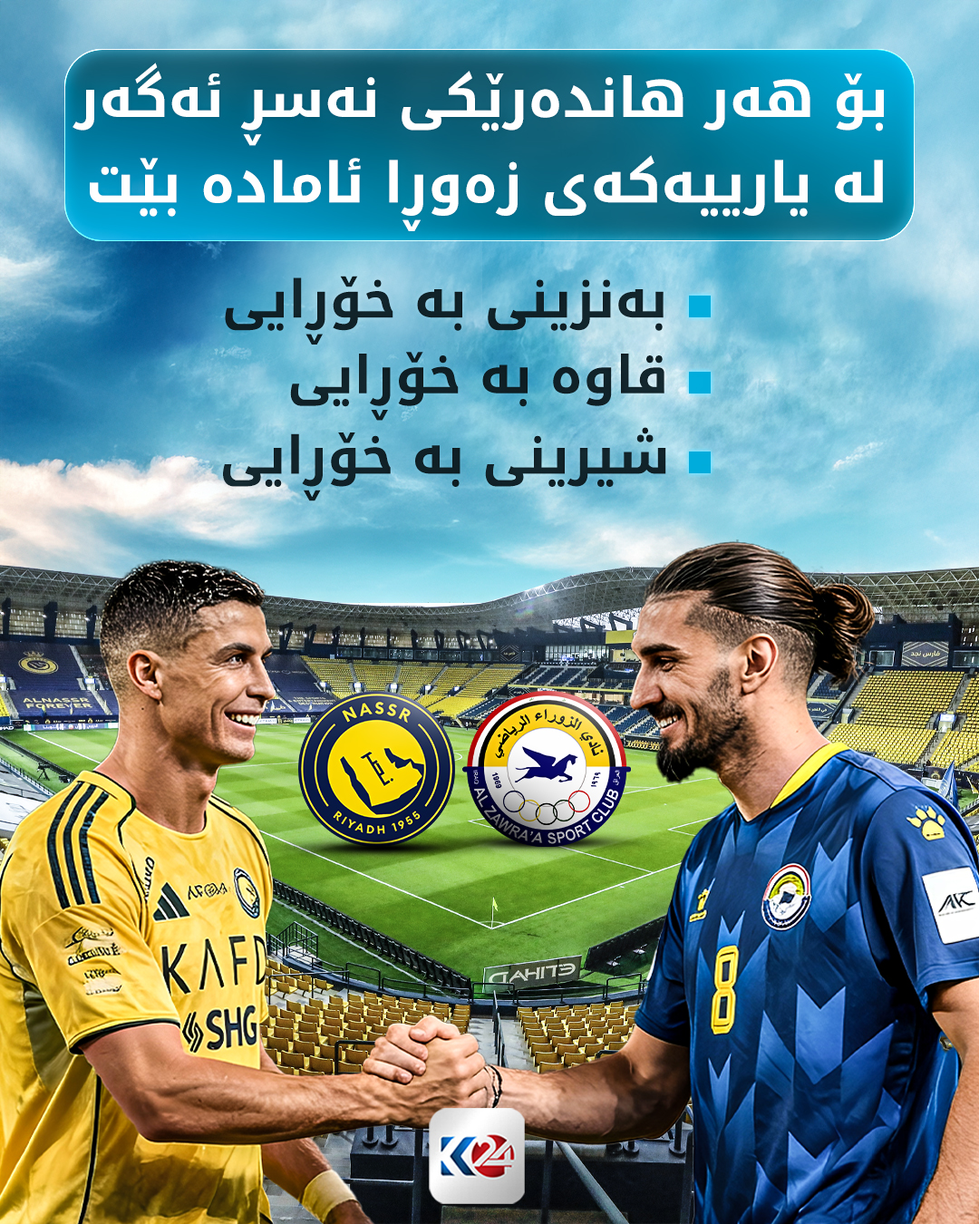 ئەمشەو لە کۆمەڵەی چوارەمی خولی یانە پاڵەوانەکانی ئاسیا2، نەسڕی سعوودی لە ریاز میوانداریی زەوڕا دەکات، کریستیانۆ رۆناڵدۆ هێرشبەری پۆرتوگاڵی کە پێشتر بەشداریی هیچ یەکێک لە پێنج یاریی یانەکەی لە پاڵەوانێتییەکە نەکردووە، بۆ یارییەکەی ئەمشەو بانگهێشتکراوە و بەشداریی دەکات، کە ئاکام هاشم بەرگریکاری کورد بۆ یارییەکەی ئەمشەو ئامادەیە و بە درێسی زەوڕا رووبەڕووی دۆن دەبێتەوە.