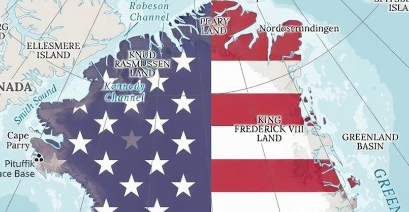 نەخشەی گرینلاند بە ئاڵای ئەمەریکاوە
