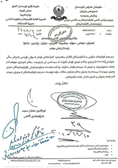 بەگوێرەی نووسراوەکە کە واژۆی "نورەددین عوسمان سەعید" بەڕێوەبەری گشتیی ئەزموونەکانی لەسەرە، بڕیاردراوە بۆ ساڵی خوێندنی (2025-2026):