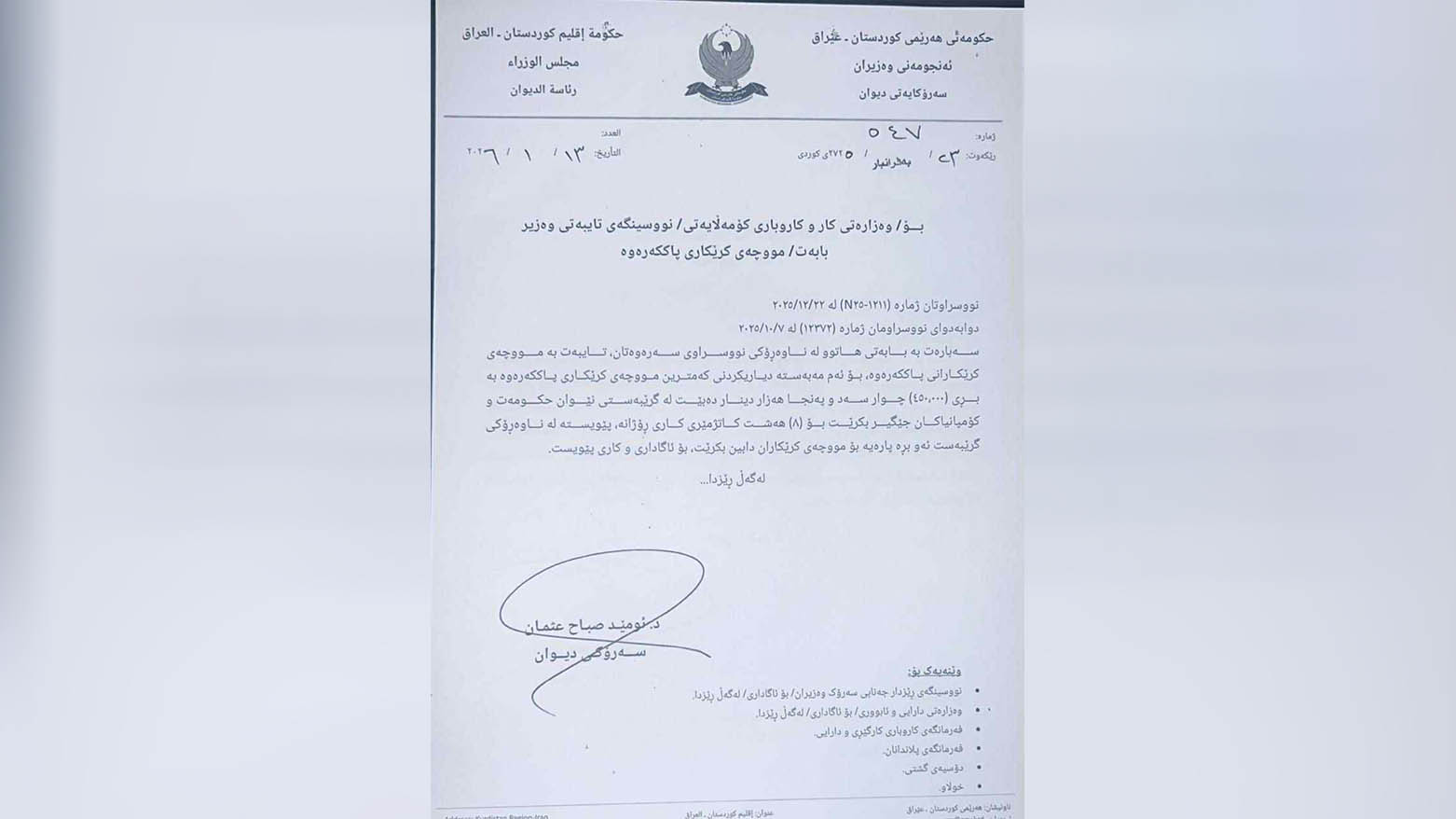 ئەمڕۆ سێشەممە 13ـی کانوونی دووەمی 2026، ئومێد سەباح، سەرۆکی دیوانی ئەنجوومەنی وەزیران ڕەزامەندی لەسەر داوایەکی وەزارەتی کار و کاروباری کۆمەڵایەتی دا، بۆ ئەوەی کەمترین مووچەی کرێکارانی ژینگە پارێز بە(450) هەزار دینار دیاری بکرێت و لە گرێبەستی نێوان حکوومەت و کۆمپانیاکان جێگیر بکرێت.
