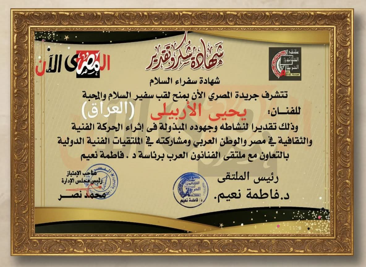 هونەرمەندی شێوەکار و خۆشنووس، یەحیا ئەربیلی، لەلایەن لێژنەی ئامادەکاری فێستیڤاڵ و بۆنە رۆشنبیرییەکان لە وڵاتی میسڕ، خەڵاتی باڵیۆزی ئاشتی پێبەخشرا و دەڵێت: لە کارەکانمدا زیاتر گرنگی بە لایەنی ئاشتی و خۆشەویستی و پێکەوە ژیان دەدەم، بۆیە ئەوان پێیان باش بوو کە ئەو نازناوە بەمن ببەخشن.