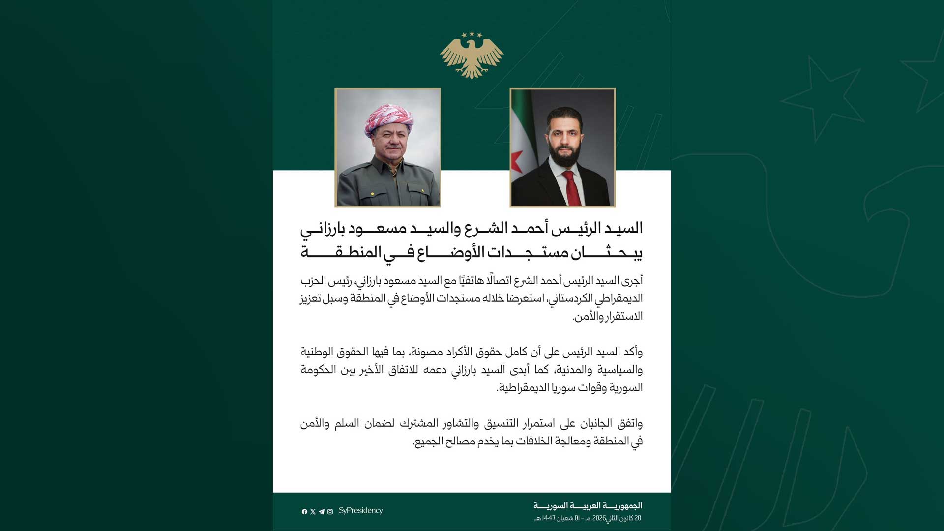 ئەم پەیوەندییە تەلەفۆنییە لە ڕێکەوتی 20ی 1ی 2026 ئەنجامدراوە، لە کاتێکدایە کە ناوچەکە بە قۆناغێکی هەستیاردا تێدەپەڕێت و هەوڵەکان بۆ گەیشتن بە لێکتێگەیشتنی سیاسی لەنێوان دیمەشق و لایەنە کوردییەکان چڕتر بوونەتەوە، بە مەبەستی ڕێگریکردن لە پێکدادان و دابینکردنی مافە دەستوورییەکانی پێکهاتەکان لە چوارچێوەی وڵاتێکی سەقامگیردا.
