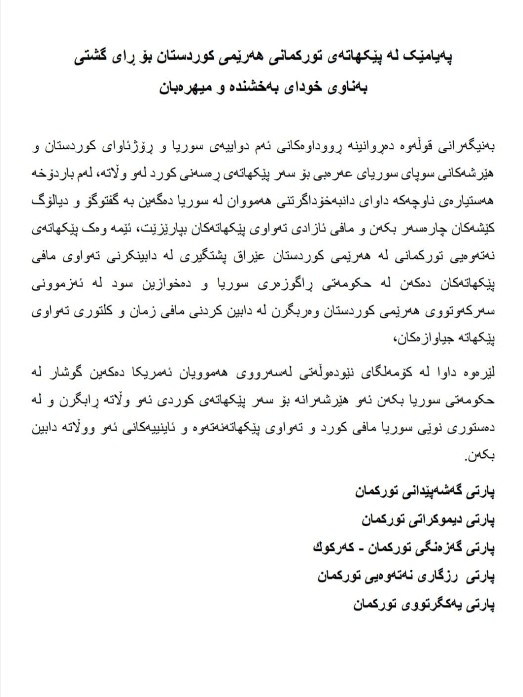 پێکهاتە تورکمانەکانی هەرێمی کوردستان لە پەیامێکی هاوبەشدا بۆ رای گشتیی، نیگەرانیی قووڵی خۆیان لەبارەی پەرەسەندنەکانی ئەم دواییەی وڵاتی سووریا و هێرشەکانی سوپای ئەو وڵاتە بۆ سەر ناوچە کوردییەکان دەربڕی و داوا دەکەن مافی هەموو پێکهاتەکان بپارێزرێت.