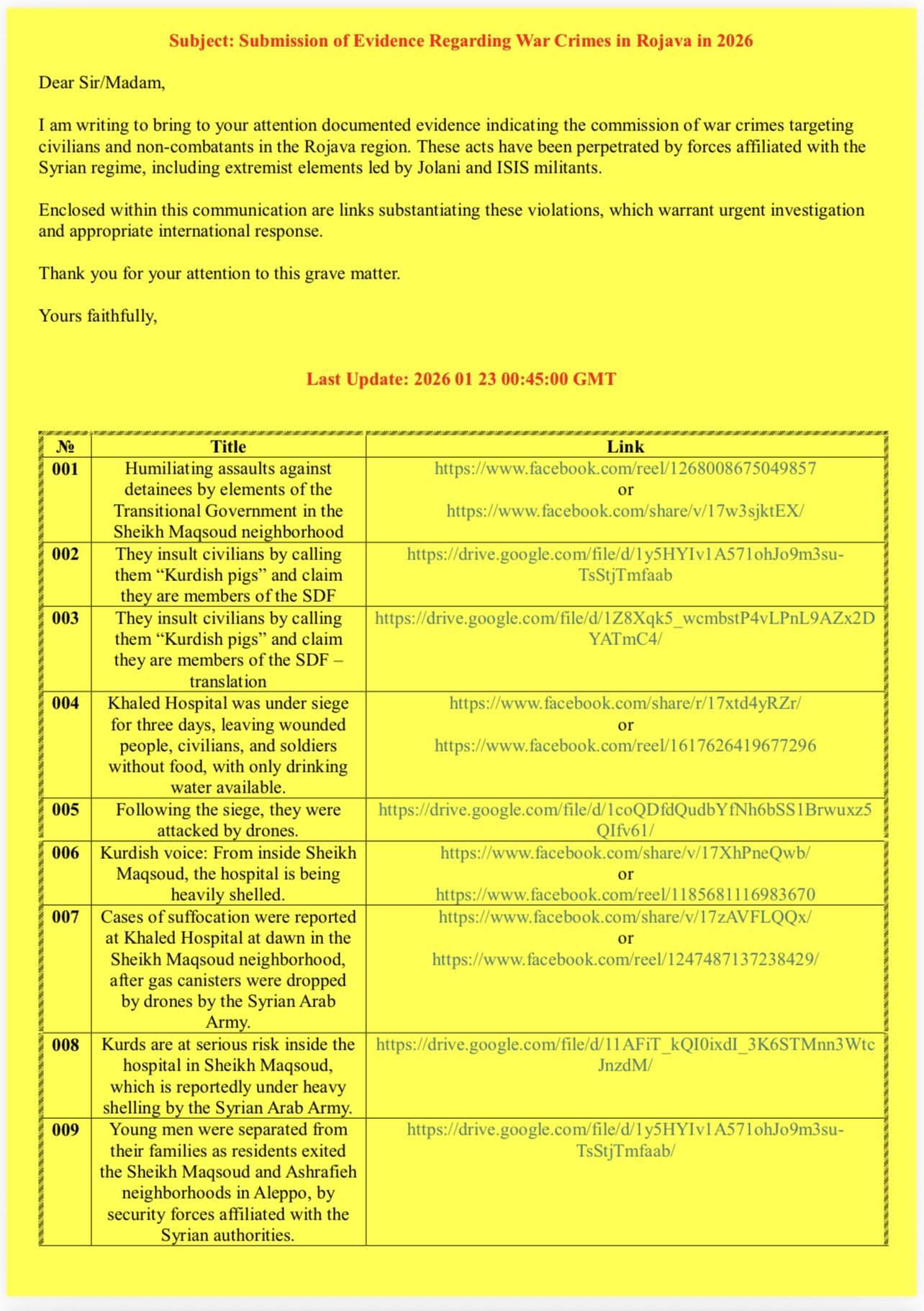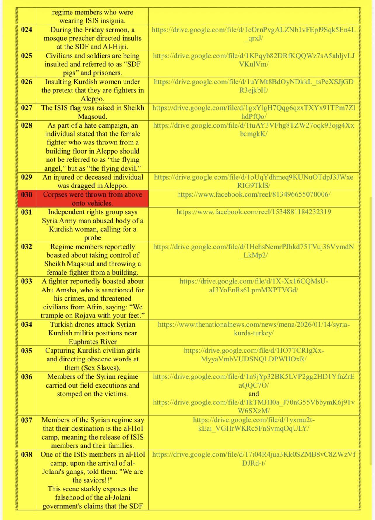 بەڕێوەبەری ناوەندیی ڕاگەیاندنی هەسەدە، نووسیویەتی: کۆمەڵێک بەڵگەی دۆکیۆمێنتکراو دەخەینە ڕوو سەبارەت بەو تاوانە جەنگییانەی کە سوپای عەرەبیی سووریا لە ماوەی کەمتر لە 17 ڕۆژی هەڵمەتە سەربازییە بەردەوامەکانیدا دژی دانیشتووانی مەدەنی لە ڕۆژئاوای کوردستان ئەنجامی داون.