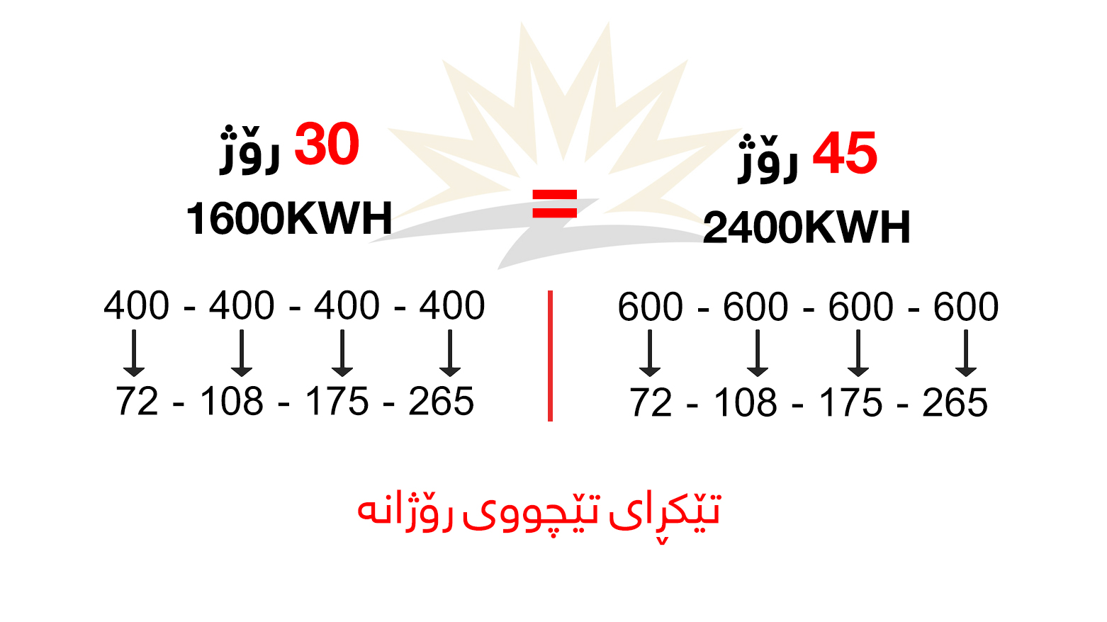600 کیلۆوات کاتژمێری یەکەم بەبڕی 72 دینار هەژمار دەکرێت، کە کۆی گشتیی تێچووی کارەبا دەبێتە 43 هەزار دینار، ئەمەش دەریدەخات، ئەگەر خێزانێک هەمان بڕی کارەبا بەکاربهێنێت لە ماوەیەکی درێژتر، ئەوا نرخی پسوولەکەی کەمتر دەکات، لەبەر ئەوەی تێکڕای بەکارهێنانی رۆژانەی کەمترە.