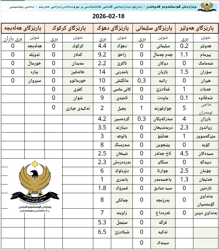 بەگوێرەی کەشی پێشبینیکراوی ئەمڕۆ چوارشەممە 18ی شوباتی 2026، ئاسمان هەندێ کات ساماڵ و پەڵە هەور دەبێت بۆ نیمچە هەوری سەرتاسەری دەگۆڕێت، بەڵام لە ناوچە شاخاوییە بەرزەکان و ناوچە سنوورییەکان ناو بە ناو ئەگەری کەمێک نمە باران هەیە، بە تایبەت لە ناوچە سنوورییەکانی سنووری پارێزگای دهۆک و بەشێک لە ئیدارەی سۆران.