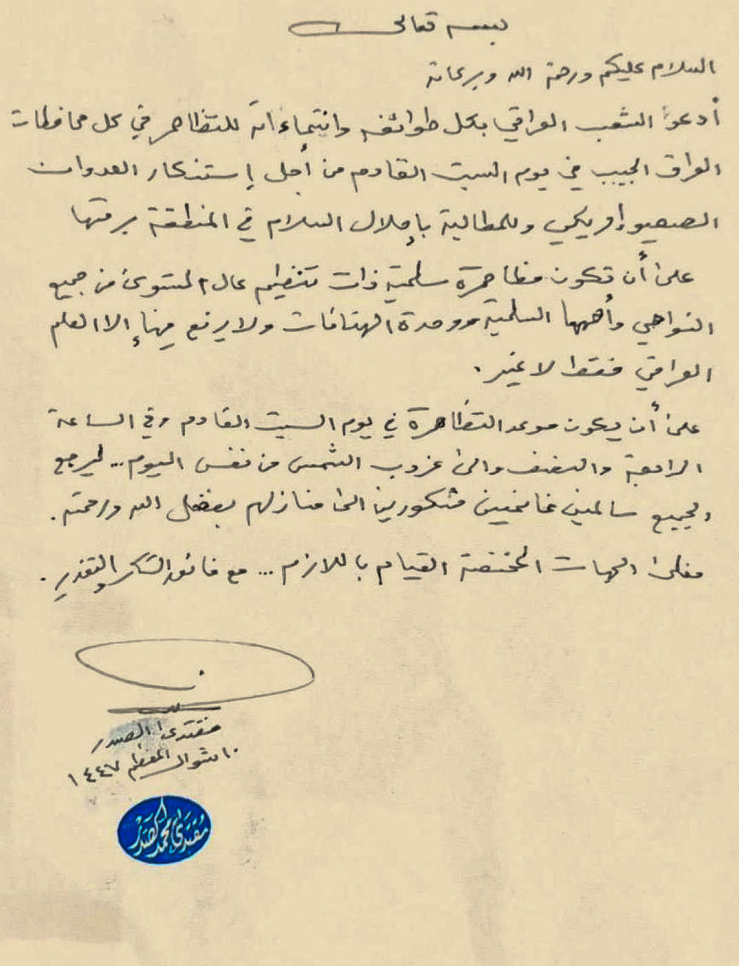سەدر لە دەستنووسەکەیدا دەڵێت "داوا لە گەلی عێراق دەکەم، بە هەموو پێکهاتە و لایەنەکانییەوە، شەممەی داهاتوو لە سەرجەم پارێزگاکانی عێراقی خۆشەویست بۆ شەرمەزارکردنی دەستدرێژیی دوژمنکارییەکانی ئیسرائیل و ئەمریکا خۆپیشاندان بکەن و داوای ئاشتی لە تەواوی ناوچەکەدا بکەن".