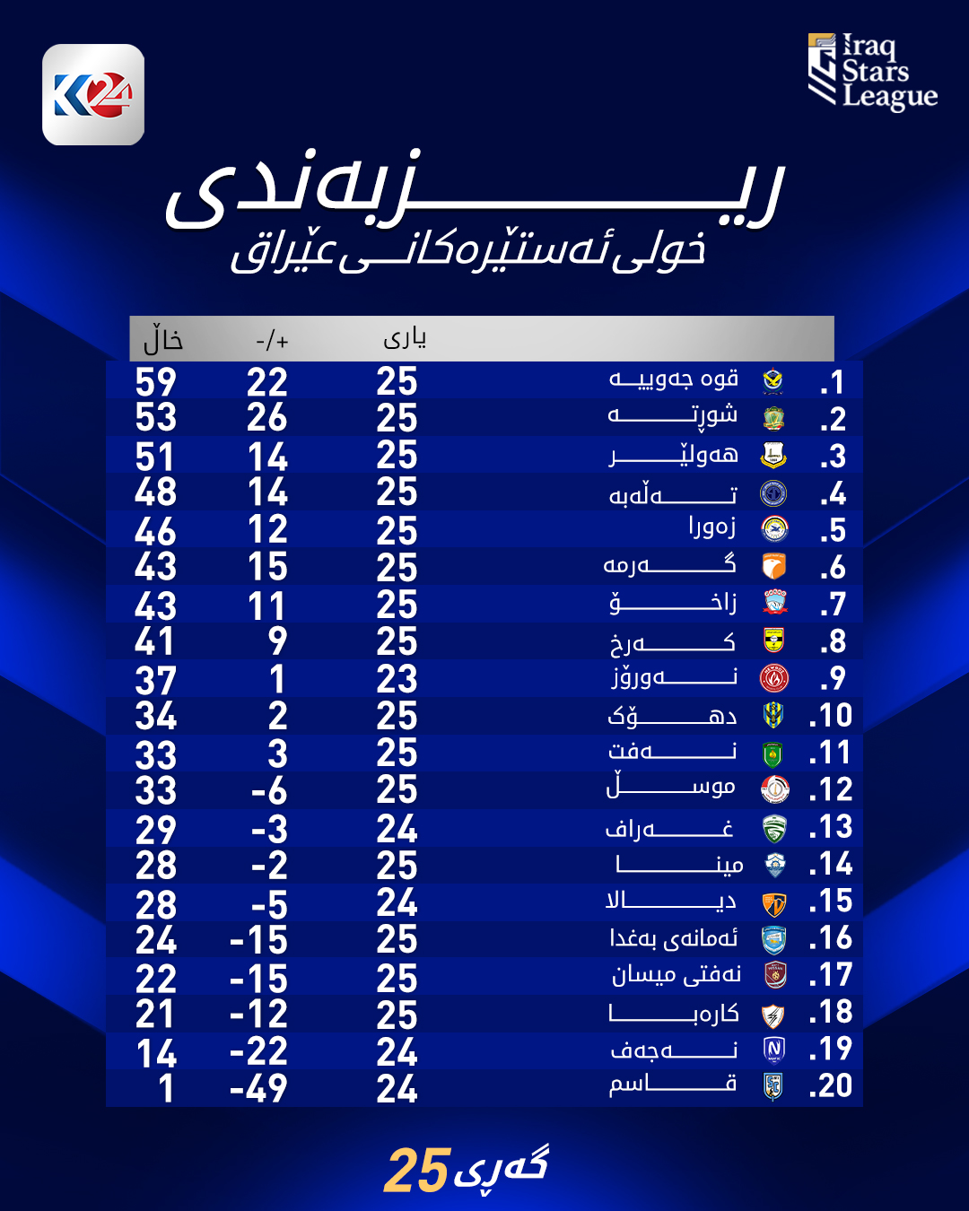یانەی نەورۆز لە گەڕی 25 خولی ئەستێرەکانی عێراق بە سەرکردایەتی وەلی کەریم راهێنەری یانەکەی، توانی لە یاریگای خۆی ئانفێڵدەکەی کوردان سێ خاڵی گرنگ، بەرامبەر یانەی نەفتی میسان بەدەست بهێنێت.